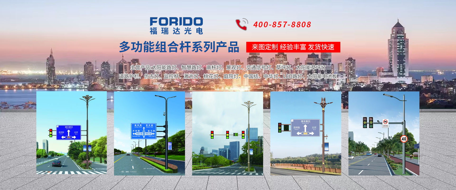 揚州福瑞達光電科技有限公司位于淮左名都歷史文化名城、中國路燈制造基地揚州市北郊菱塘工業園,公司占地面積76000平方米,注冊資金10518萬元,擁有高級技術嫻熟的員工280多人,擁有大型折彎機、激光切割、數控注塑機、壓鑄機、自動埋弧焊、氣焊、彩色粉末靜電噴塑等大型自動化設備,我公司是一家集設計、研發(fā)、生產、銷售、施工安裝服務為一體的戶外交通照明產品制造商,主要生產智慧路燈、太陽能路燈、LED路燈、高桿燈、景觀燈、交通信號燈、交通標志牌、通信鐵塔、路跨鋼結構、公交站臺、太陽能光伏組件、景點亮化、樓宇亮化工程的設計施工等。公司秉承開拓創(chuàng)新、銳意進取、精誠服務的企業精神,堅持以“誠信為本、技術為先、服務是金”的合作理念,我們憑借先進的制造工藝、優(yōu)質的產品質量、合理的市場價格和完善的售后服務贏得了廣闊的市場和客戶的信賴。  我公司已通過ISO9001質量體系認證、ISO14001環(huán)境管理體認證,CQC產品認證,中國節(jié)能產品認證,通過“CCC”強制性產品認證,具有市政總承包,照明,交安,設計等資質···